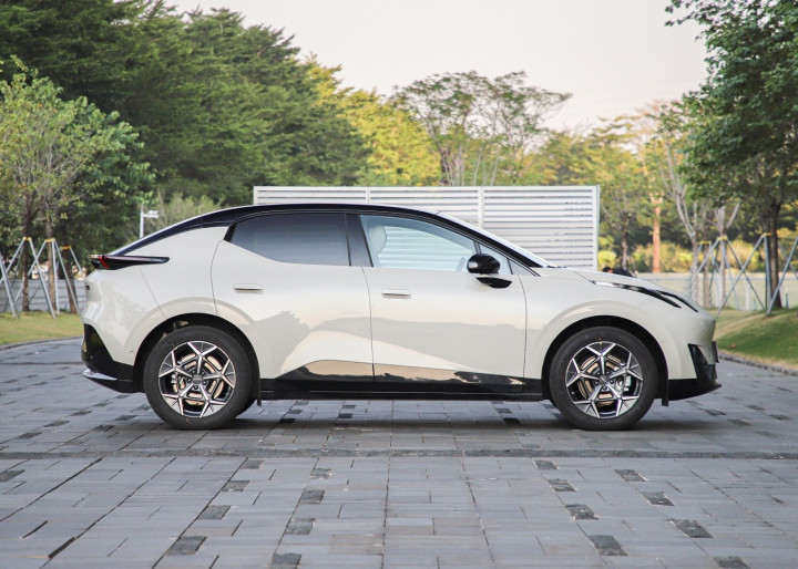 再来看新车的车身侧面部分,车身造型饱满而紧凑,车顶有着明显的下滑式造型来增加轿跑定位,车顶整体为熏黑的配色,与熏黑的车窗相连接,形成了悬浮式车顶造型,车门部分的腰线为贯穿式造型,棱角分明连接隐藏式车门把手,整体感与层次感都很不错,外扩的轮眉以及车门下方内凹的设计相结合,看起来更加的厚重,花瓣式的大尺寸轮毂以及熏黑的车裙设计也很耐看。车身尺寸方面,该车的车身尺寸长宽高分别为4460/1845/1573毫米,轴距为2755毫米,各项数据与在售车型相同。2755mm轴距实现4.03㎡"套内面积",后排腿部空间达850mm,1.9米身高者不顶头。